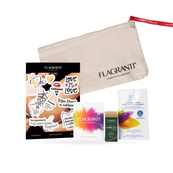 Elegantní zlatá a plně diskrétní, neprůhledná taštička ukrývá vzorek prémiového lubrikantu navrženého Flagranti na míru a vyrobeného pouze z přírodních látek. Najdete v ní intimní ubrousek značky LADYCUP pro obnovení svěžesti intimních partií, který může posloužit také k očištění menstruačního kalíšku. Chybět nesmí ani prvotřídní kondom zajišťující ochranu proti přenosu pohlavních chorob a zabraňující nechtěnému početí. Jako bonus jsou přiloženy jedinečné nálepky navržené a inspirované vášní. Jakmile obsah taštičky použijete, můžete kosmetickou taštičku využít pro uschování kosmetiky nebo třeba erotických pomůcek, fantazii se meze nekladou…