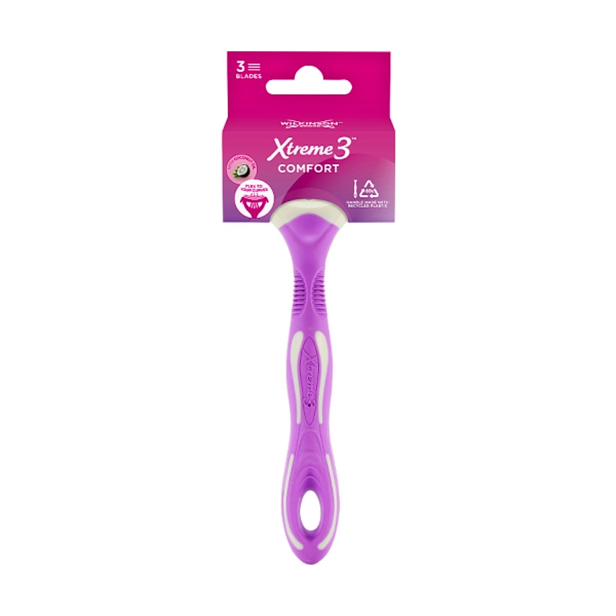 Dámy, dopřejte si jedinečnou péči při holení ať už jste kdekoliv a objevte kouzlo hedvábně sametové pokožky. Tento jedinečný holicí strojek WILKINSON Sword Xtreme 3 Comfort pro ženy si zamilujete. Jednorázový strojek je spolehlivý nástroj pro dosažení efektivního dokonale hladkého oholení. Je ideální pro celé tělo, včetně intimních partií. Chlubí se hned třemi ostrými břity a flexibilní ohebnou hlavicí, která se perfektně přizpůsobí křivkám vašeho těla a dovoluje holení v jakémkoliv směru. Dva zvlhčující proužky před i za břity s obsahem Aloe Vera a jojobového oleje minimalizují podráždění pokožky. Aloe má navíc protialergické a protizánětlivé účinky, ničí bakterie, viry a plísně, skvěle hydratuje a v neposlední řadě snižuje krvácení a urychluje hojení. Jistě vás potěší příjemná pogumovaná rukojeť s protiskluzovou úpravou, díky které vám nabídne pohodlnou manipulaci. Ke všemu je vyrobena z 60% z recyklovaného plastu. Průhledný ochranný kryt jej udrží v čistotě i na cestách, pokud si jej budete chtít vzít s sebou do kabelky. V balení naleznete jeden kus. Používejte s gelem nebo pěnou na holení pro změkčení chloupků před holením.