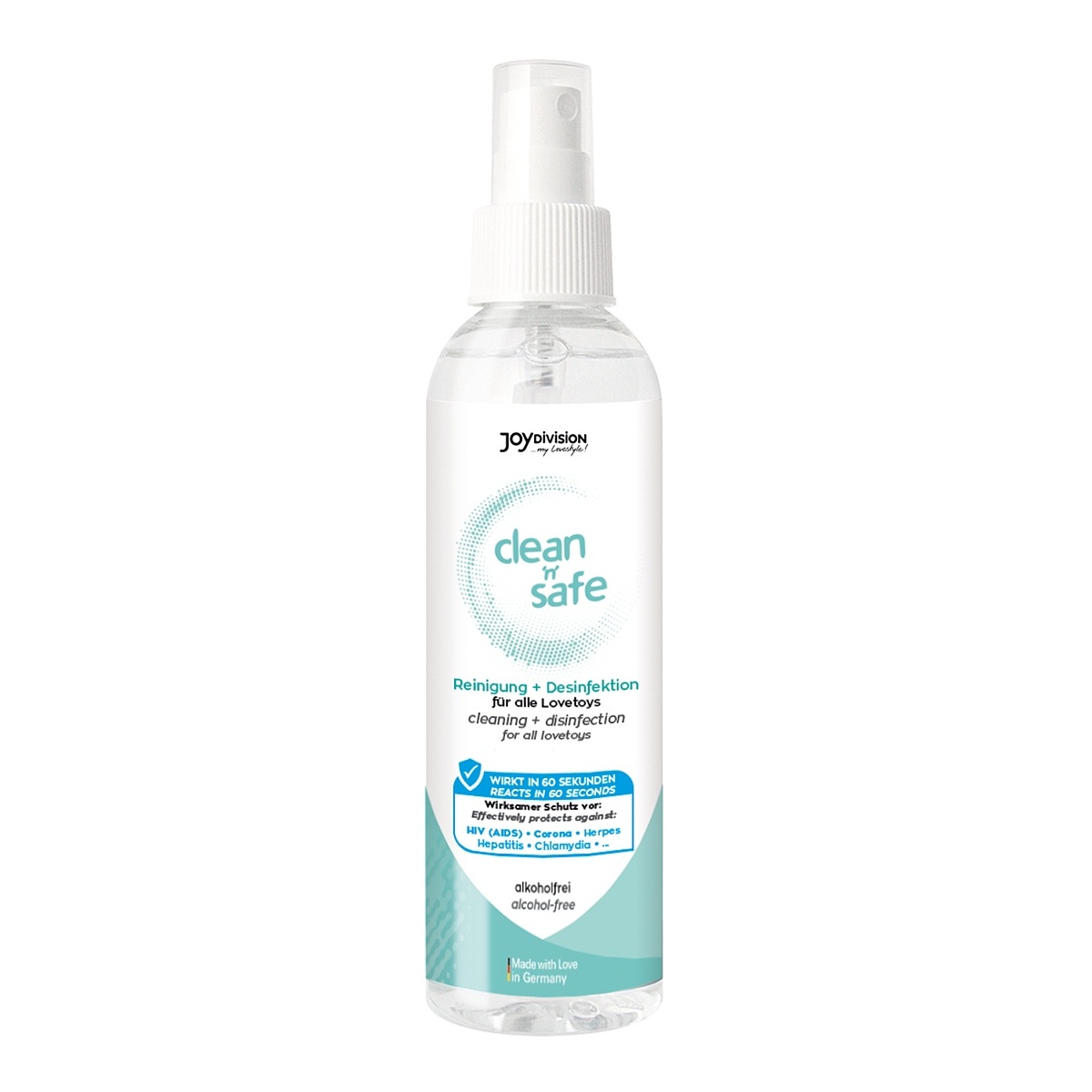 Mějte své miláčky vždy v naprosté čistotě a dopřejte jim dokonalou očistu, která vás ochrání. Třeba s tímto čisticím prostředkem Clean and Safe od německé značky JoyDivision v objemu 200 ml. Čisticí a dezinfekční sprej můžete použít nejen na údržbu vašich erotických pomůcek, které je třeba vyčistit, abyste si mohli i nadále užívat všestrannou sexuální zábavu. Účinně bojuje proti virům a bakteriím, jako je covid-19, herpes, žloutenka, chlamydie, AIDS. Tekutina neporušuje citlivé materiály a díky svému jemnému složení je obzvláště vhodná pro citlivou pokožku nebo sliznice. Můžete použít na silikon, latex, všechny plasty i Silikomed (TPE). Praktická lahvička s rozprašovačem, která jej rovnoměrně a přesně nanese na vaše erotické pomůcky. Po použití bude vaše hračka svěží, čistá a zdravotně nezávadná, připravena k dalšímu použití. Prostředek je dermatologicky testován.