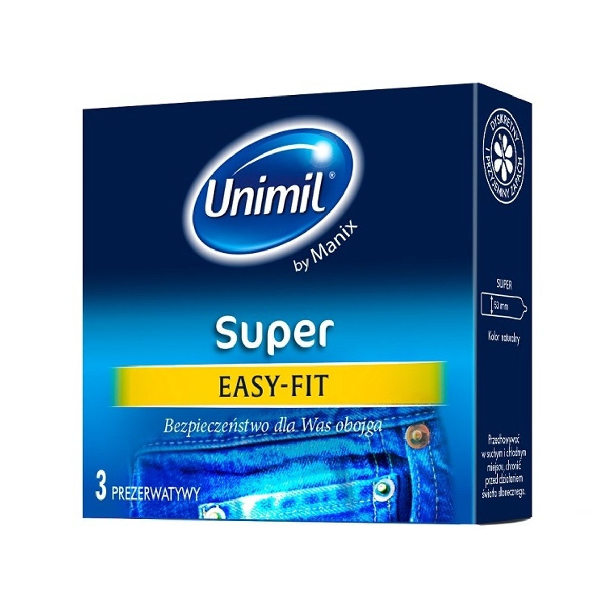 Fantastický kondom Unimil super kombinuje výhodu bezpečí klasického prezervativu s jedinečným komfortem. Je vyroben z přírodního kaučuku prvotřídní kvality v transparentní barvě bez příchutě a bez vůně. Se svou délkou 18 cm, nominální šířkou 5,3 cm a tenkou stěnou se perfektně přizpůsobí téměř každému penisu, dopřeje autentické pocity rozkoše a jeho rovný tvar bude příjemný a maximálně pohodlný. Navíc zaručí ještě snadnější nasazení. Má hladký povrch zakončen zesíleným prstencem na konci, který jej zafixuje u kořene penisu. Kondom také disponuje prostorným rezervoárem pro záchyt spermatu. Lubrikován je jemným silikonovým gelem, který báječně klouže a pro případ nutnosti je připraven na další dávku lubrikačního gelu na vodní bázi. V balení naleznete 3 jednotlivě zabalené kusy pro nezapomenutelnou noc plnou vášně.