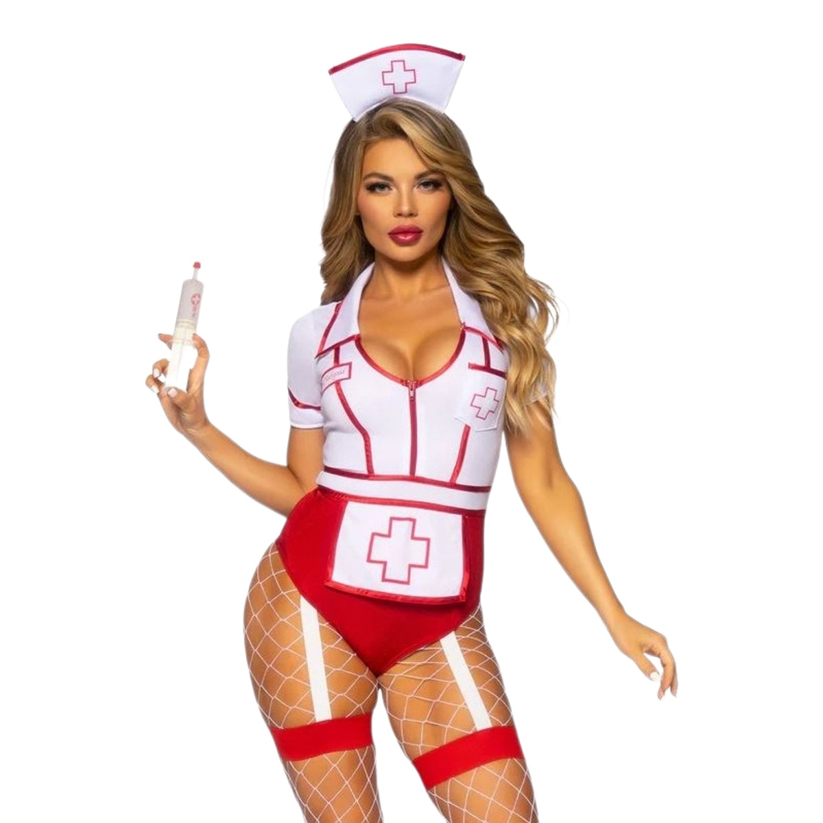Necítíte se zcela ve své kůži? Nechejte se vyšetřit. Každý muž si přeje potkat okouzlující zdravotní sestřičku, která mu ráda a něžně pofouká rány. Objevte tento fantastický kostým Leg Avenue Nurse Feelgood v půvabném provedení a vychutnejte si vzrušující role-play hrátky, které ještě více zrychlí váš tep. Kostým obsahující body a čelenku je ušitý z hedvábně jemného a sametově hebkého materiálu, který báječně pohladí vaši pokožku a příjemně se nosí. Tkanina je extrémně pružná, pevná a dokonale se přizpůsobí vašim křivkám. Přiléhavé body s límečkem a krátkými rukávy v sexy designu červené a bílé barvy omámí všechny smysly pacienta díky unikátnímu hlubokému výstřihu, ve kterém perfektně vyniknou vaše přednosti. V dekoltu navíc naleznete krátký zip, kterým můžete odhalit vše v případě, že by kolaboval a vy byste musela využít rychlé první pomoci. Po rozepnutí se jistě znovu probudí k životu. Nechybí ani integrovaná zástěrka s křížem v oblasti bříška. Moderní střih povznese váš zadeček na novou úroveň a stane se pro vašeho svěřence naprosto neodolatelný. Navíc jsou k body připevněné elastické podvazky, které ozdobí vaše stehna. V rozkroku pak naleznete plastové cvočky, kterými umožníte přístup k vašemu klínu, pokud by nebyla vaše léčba účinná. Aby byl celkový dojem kompletní, nasaďte si čelenku s motivem kříže, ve které nebude pochyb, že svého milence zachráníte. punčochy nejsou součástí balení.