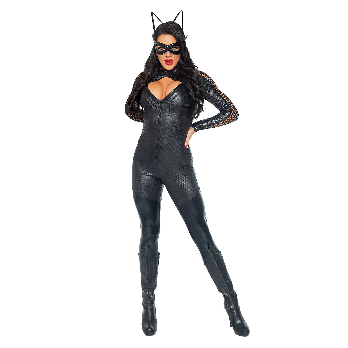 Osvěžte si svůj milostný život hraním rolí. Vy budete kočička, o kterou je potřeba se dobře starat, pak budete velice přítulná a hravá. Nebo se snad chystáte na maškarní párty? Pokud chcete dovést svůj převlek k dokonalosti, pak si pořiďte tento kostým Wicked Kitty od značky Leg Avenue. Tento ultimátní obleček vám zajistí 100% pozornost. sexy přiléhavá kombinéza vás obepne jako vaše druhá kůže a zdůrazní křivky. Na přední části je látka vzorovaná a matná, což dělá z kombinézy opravdu exkluzivní kousek. Hluboký výstřih, který ukáže vaše naditá ňadra, můžete ještě zvětšit pomocí zipu na přední části, vedoucí až k pupíku. Catsuit má dlouhé rukávy, jejichž část tvoří síťované průstřihy. Zezadu je kombinéza celá hladká a lesklá. Součástí kostýmu je ještě opasek se dvěma kapsičkami, stylová maska na oči a čelenka s drátěnými oušky. Celkový vzhled vytváří dojem opravdu luxusního kočičího oblečku.