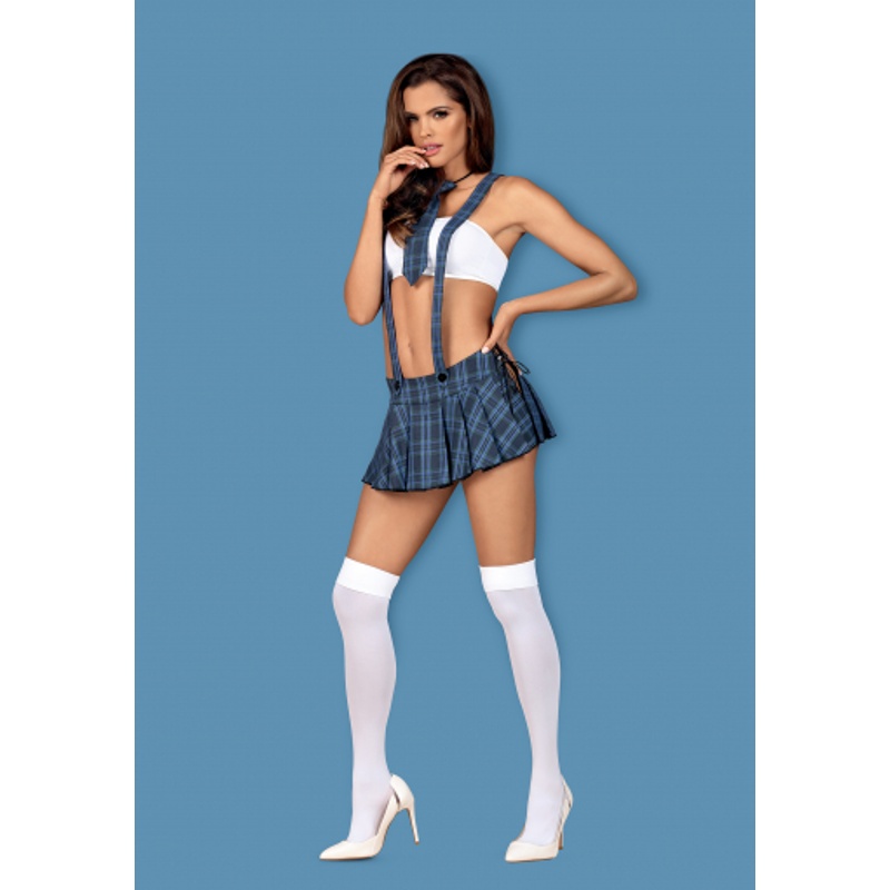 Ráda se učíte novým věcem? Využijte své studijní znalosti zajímavějším a zábavnějším způsobem. Oblečte se do školní uniformy a čekejte na první zvonění. V tomto kostýmu Obsessive STUDYGIRL COSTUME se můžete v mžiku proměnit v nevinnou či zlobivou školačku a věnovat se svému profesorovi. souprava obsahuje kravatu, krátký top, sukni s kšandami, kalhotky a punčochy. Modrá kravata je již zavázaná na kulaté gumě, která je příjemná na nošení a neřeže. Bílý širší pás z pružné avšak pevné multistretchové látky zakrývá jen prsa, takže odhalí vaše bříško, což mnoho mužů velmi přitahuje. Nařasená minisukně z typického károvaného vzoru má na bocích hluboké rozparky zavázané na tenké stuhy. V přední části má falešné knoflíky, které imitují zapínání kšand. Ty jsou na zádech překřížené. Dále v balení naleznete minimalistická bílá tanga, která mají v rozkroku bavlněnou podšívku pro váš maximální komfort. Poslední díl pro pilnou studentku jsou bílé punčochy.