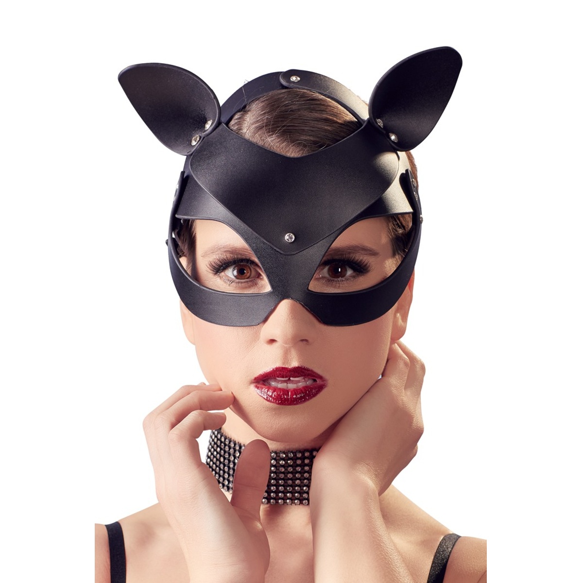 Ergonomicky tvarovaná maska černé barvy je vyrobena z veganské imitace kůže, která je na dotek měkká, příjemná a zároveň vysoce odolná. Hladký povrch se elegantně leskne a působí sofistikovaně, zatímco vnitřní povrchová úprava připomínající samet dodá komfort vaší pleti i při delším nošení. Roztomilá ouška dodávají celku hravou kočičí podobu a kovové nýtky s třpytivými kamínky přinášejí jiskřivý akcent, který zvýrazní vaši svůdnou stránku. Díky nastavitelnému popruhu s kovovou přezkou maska pevně sedí a dokonale se přizpůsobí obličeji.