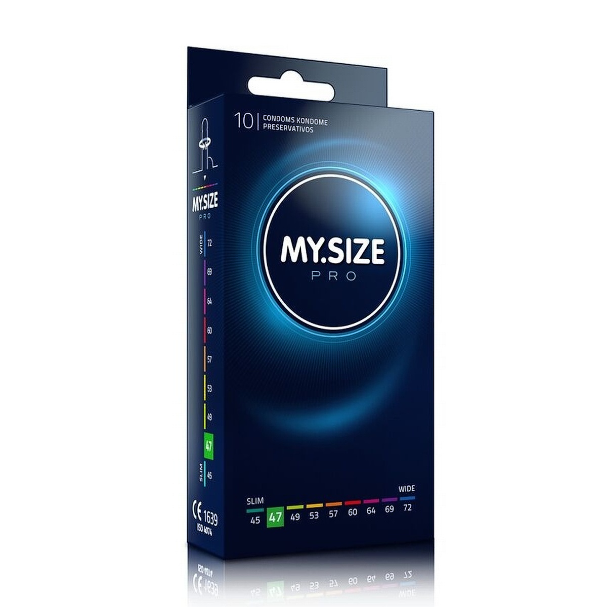 Pánové, vaše vzrušení a intenzivní prožitky jsou přímo závislé na vašem pohodlí. Dopřejte si dokonale padnoucí velikost a vychutnejte si i se svou drahou polovičkou novou dimenzi chráněného a bezpečného sexu. kondomy značky MY.SIZE jsou jedinečné právě v tom, že si vyberete šířku takovou, aby vám byl tak akorát. Nevhodný kondom nepřinese požadované potěšení, klouže nebo je naopak velmi těsný, což zvýší nepohodlí. Tento kondom má jmenovitou šířku 47 mm a délku 16 cm a je ideální pro průměr penisu přibližně 3 cm až 3,2 cm. Disponuje rezervoárem a snadno se nasazuje.