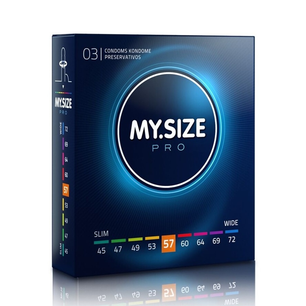 Pánové, vaše vzrušení a intenzivní prožitky jsou přímo závislé na vašem pohodlí. Dopřejte si dokonale padnoucí velikost a vychutnejte si i se svou drahou polovičkou novou dimenzi chráněného a bezpečného sexu. kondomy značky MY.SIZE jsou jedinečné právě v tom, že si vyberete šířku takovou, aby vám byl tak akorát. Nevhodný kondom nepřinese požadované potěšení, klouže nebo je naopak velmi těsný, což zvýší nepohodlí. Tento kondom má jmenovitou šířku 57 mm a délku 16 cm a je ideální pro průměr penisu přibližně 3,7 cm až 3,9 cm. Disponuje rezervoárem a snadno se nasazuje.
