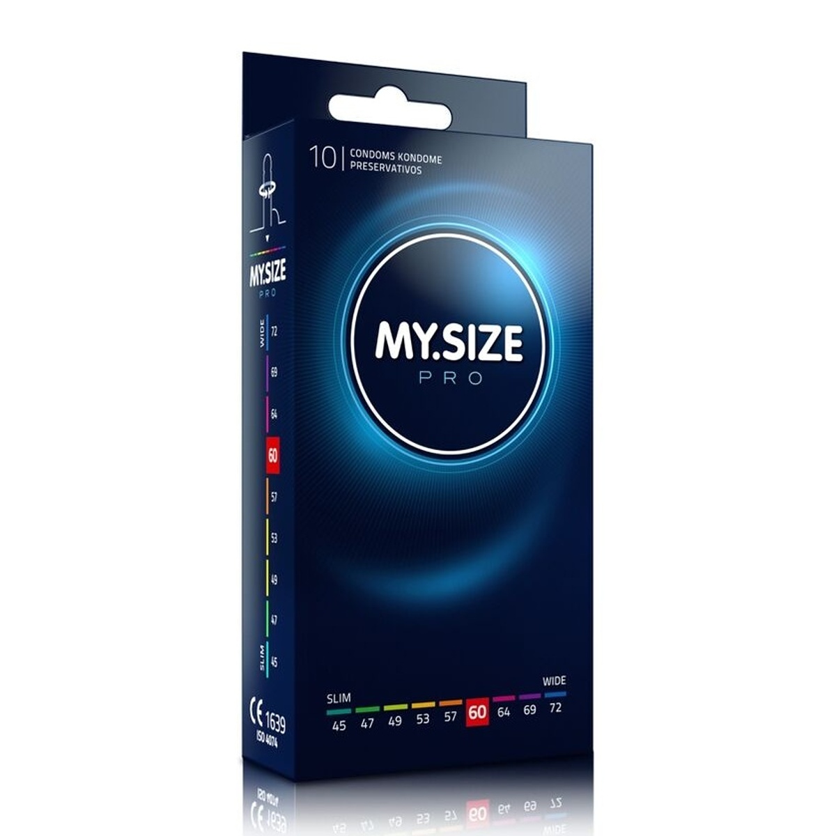 Pánové, vaše vzrušení a intenzivní prožitky jsou přímo závislé na vašem pohodlí. Dopřejte si dokonale padnoucí velikost a vychutnejte si i se svou drahou polovičkou novou dimenzi chráněného a bezpečného sexu. kondomy značky MY.SIZE jsou jedinečné právě v tom, že si vyberete šířku takovou, aby vám byl tak akorát. Nevhodný kondom nepřinese požadované potěšení, klouže nebo je naopak velmi těsný, což zvýší nepohodlí. Tento kondom má jmenovitou šířku 60 mm a délku 16 cm a je ideální pro průměr penisu přibližně 3,9 cm až 4,2 cm. Disponuje rezervoárem a snadno se nasazuje.