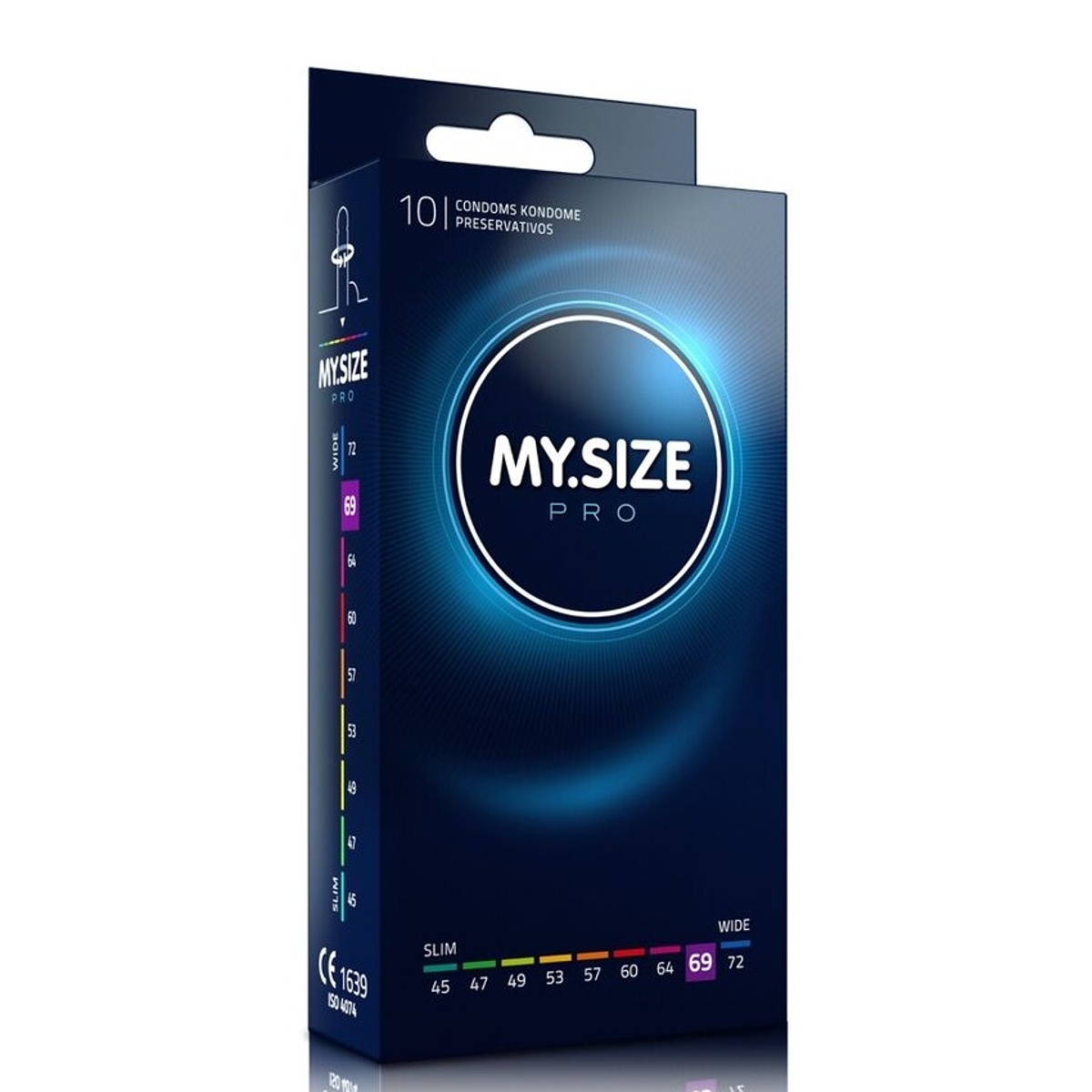 Pánové, vaše vzrušení a intenzivní prožitky jsou přímo závislé na vašem pohodlí. Dopřejte si dokonale padnoucí velikost a vychutnejte si i se svou drahou polovičkou novou dimenzi chráněného a bezpečného sexu. kondomy značky MY.SIZE jsou jedinečné právě v tom, že si vyberete šířku takovou, aby vám byl tak akorát. Nevhodný kondom nepřinese požadované potěšení, klouže nebo je naopak velmi těsný, což zvýší nepohodlí. Tento kondom má jmenovitou šířku 69 mm a délku 16 cm a je ideální pro průměr penisu přibližně 4,5 cm až 4,8 cm. Disponuje rezervoárem a snadno se nasazuje.