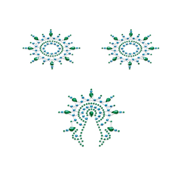 Čeká vás žhavý večer, kdy se chystáte svého milého překvapit striptýzem? Máme pro vás úžasný šperk, kterým mu vyrazíte dech! Nálepky GLORIA glittering jewelry v zelenomodré kombinaci ozdobí vaše ňadra a klín decentně, přesto vyzývavě. Jsou vyrobeny z drobných křišťálů. Šperky jsou opatřeny lepidlem šetrným k pokožce a lze je snadno upevnit i sundat. Se speciálním lepidlem je můžete používat opakovaně.