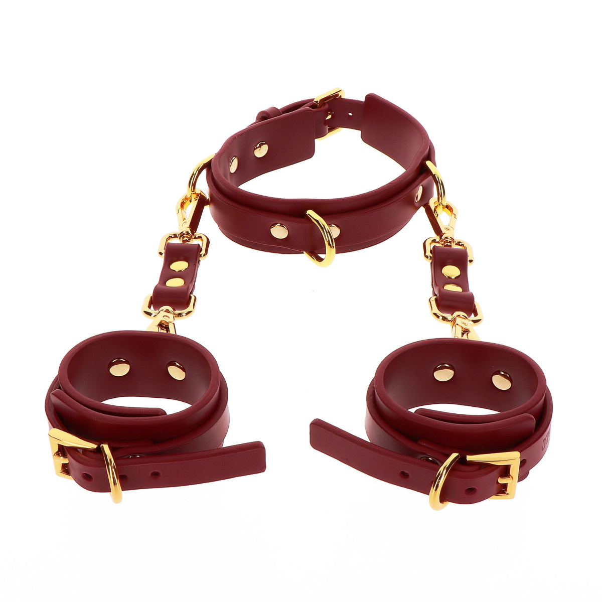 Obojek a pouta jsou vyrobeny z kvalitní a odolné veganské kůže, která se velmi dobře udržuje a čistí. Doplněny o zlaté prvky z kovu bez obsahu niklu, který je vhodný i pro alergiky. Pouta i obojek jsou nastavitelná, čímž se plně přizpůsobí vašim potřebám. Na obojku naleznete poutko, na které je možné připnout vodítko a zapojit tak do svých fantazií i petplay.