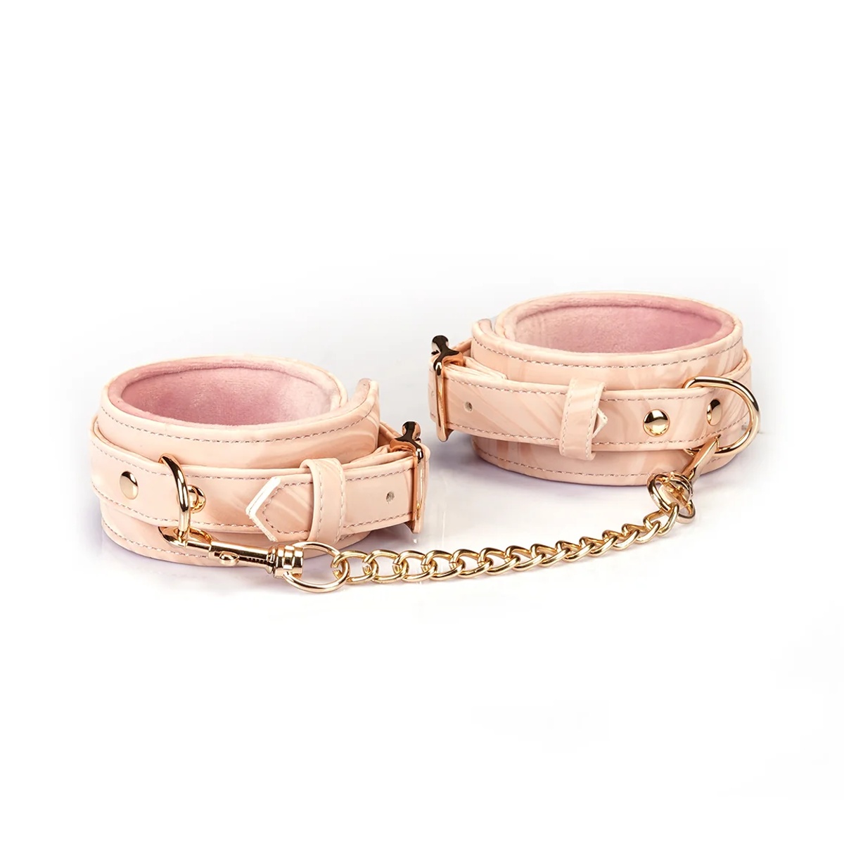 Elegantní design z přepychové kolekce Boudoir Amor romantické růžové barvy vám přináší tato svůdná pouta na kotníky, která se stanou nutností pro všechny, kteří chtějí povznést své erotické touhy. Jsou ručně vyrobena z vysoce kvalitní umělé veganské kůže a byla zpracována v té nejvyšší možné kvalitě a japonské preciznosti. Má úžasný sametově hebký povrch, který vás nadchne při každém doteku. Široké popruhy matného žíhaného charakteru s robustní zlatou kovovou přezkou zaručí přesné individuální nastavení, aby perfektně padly každému otrokovi a nabídnou dokonalé pohodlí při nošení. Z vnitřní strany jsou ke všemu podšité jemným plyšem, který znásobí komfort nositelky. velký D kroužek je připraven na připojení delšího zlatého řetízku z kvalitního kovu, který je na obou koncích zakončen karabinou. Díky tomu dopřeje pevné spoutání i rychlé osvobození. Všechny materiály jsou vysoce odolné, aby vám poskytly dlouhé roky svých služeb.