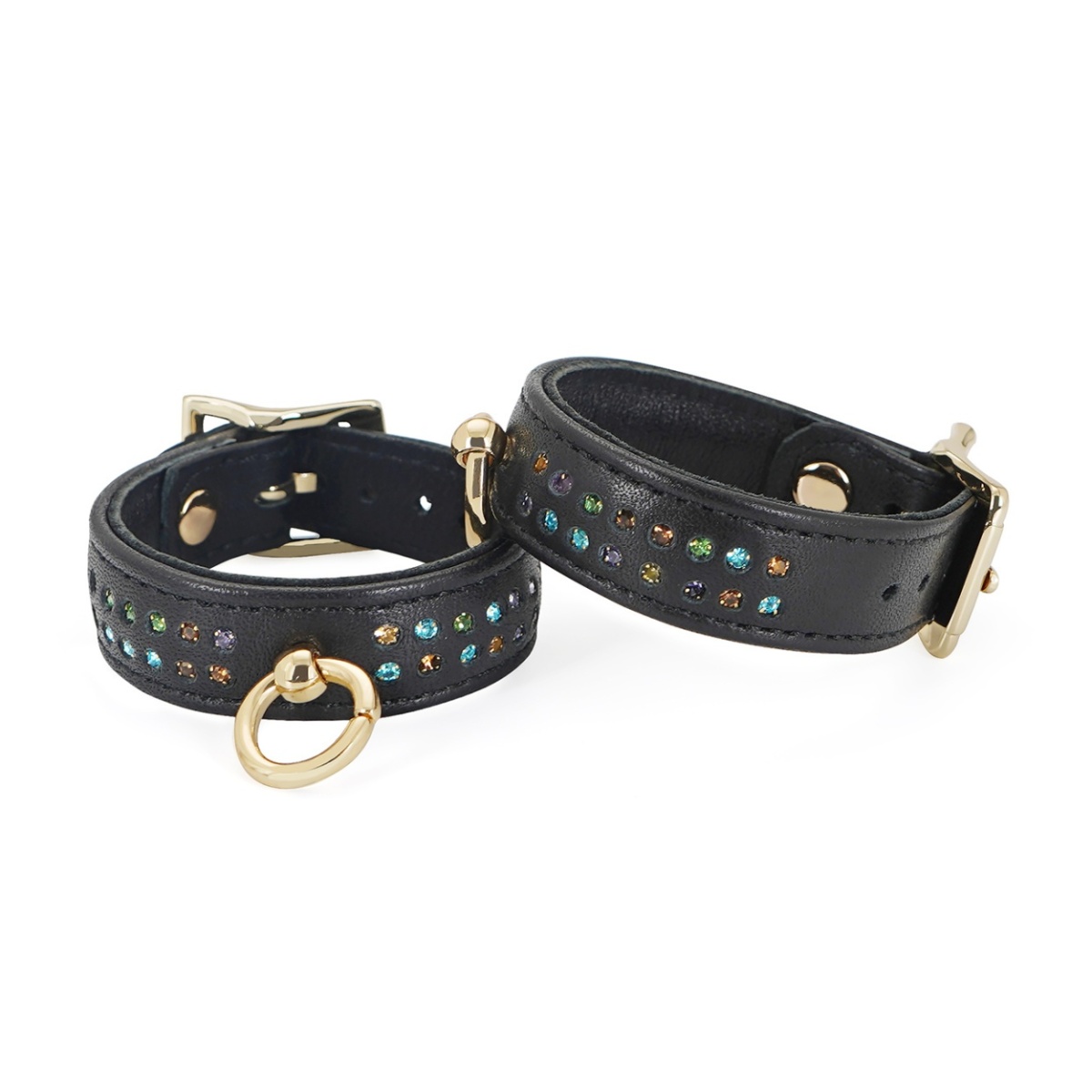 Každá rozpustilá subinka teď může doslova zazářit. Dopřejte si nekonečnou dávku luxusu vašich nezbedných BDSM hrátek s těmito parádními pouty na ruce unikátní kolekce značky Liebe Seele. Vysoce kvalitní zpracování produktů této japonské značky a luxusní materiály vás naprosto okouzlí a dodají vám šmrnc. Pouta na zápěstí temně černé barvy jsou vyrobena z pravé hovězí kůže, která je pevná a velmi kvalitní. Zápěstní řemínky jsou tenčí, a tak krásně ozdobí zápěstí každé dámy, vyznávající i něžnější styl bondáže, navíc štrasové kamínky v několika barvách působí stejně jako nádherné bižuterní náramky. Vybraná hovězina je zároveň velmi pohodlná i na své vnitřní straně, a tak se nemusíte obávat šrámů ani po drsnější jízdě. Jsou ozdobena kovovými O kroužky v půvabné zlaté barvě. Zapínají se na přezky a nabídnou tak univerzálně širší nastavení velikosti, které padne téměř každému. Jemnějšími karabinami s řetízkem vaši subinku pevně spoutáte a následný ložnicový scénář je zcela ve vaší režii. Luxusní balení bude parádním dárkem pro nejednu podřízenější uličnici.