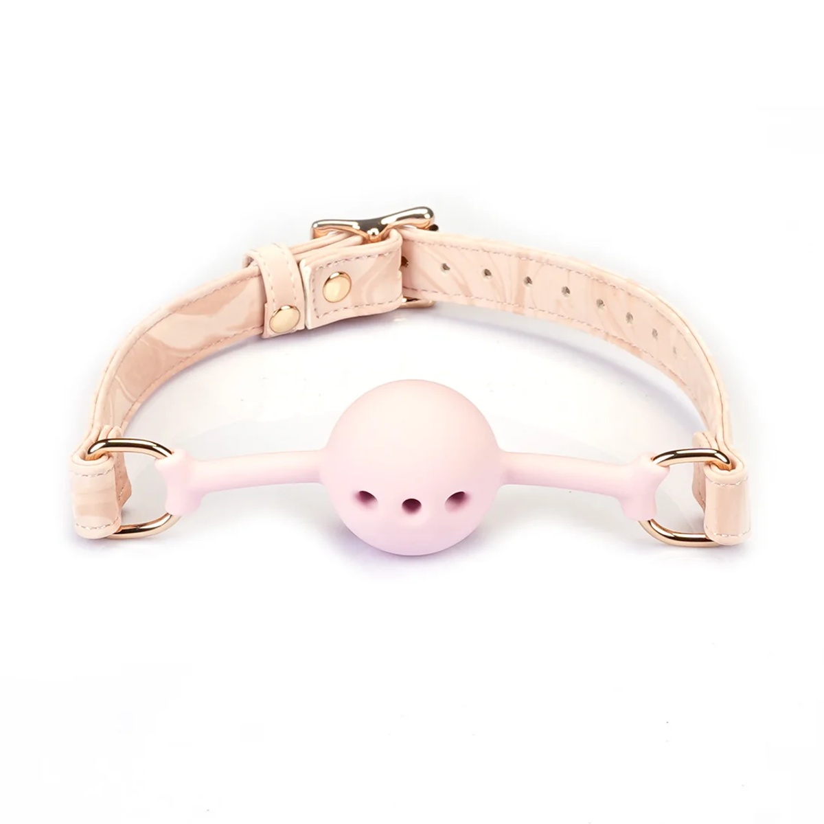 Elegantní design z přepychové kolekce Boudoir Amor romantické růžové barvy vám přináší tento svůdný roubík, který se stane nutností pro všechny, kteří chtějí povznést své erotické touhy. Je ručně vyroben z vysoce kvalitní umělé veganské kůže a byla zpracována v té nejvyšší možné kvalitě a japonské preciznosti. Má úžasný sametově hebký povrch, který vás nadchne při každém doteku. Popruhy matného žíhaného charakteru s robustní zlatou kovovou přezkou zaručí přesné individuální nastavení, aby perfektně padla každému otrokovi a nabídnou dokonalé pohodlí při nošení. Měkký míček z prémiového silikonu prvotřídní potravinářské kvality má hedvábný povrch. Navíc disponuje třemi otvory, které usnadňují dýchání, takže bude váš sub naprosto v bezpečí. Všechny materiály jsou vysoce odolné, aby vám poskytly dlouhé roky svých služeb.