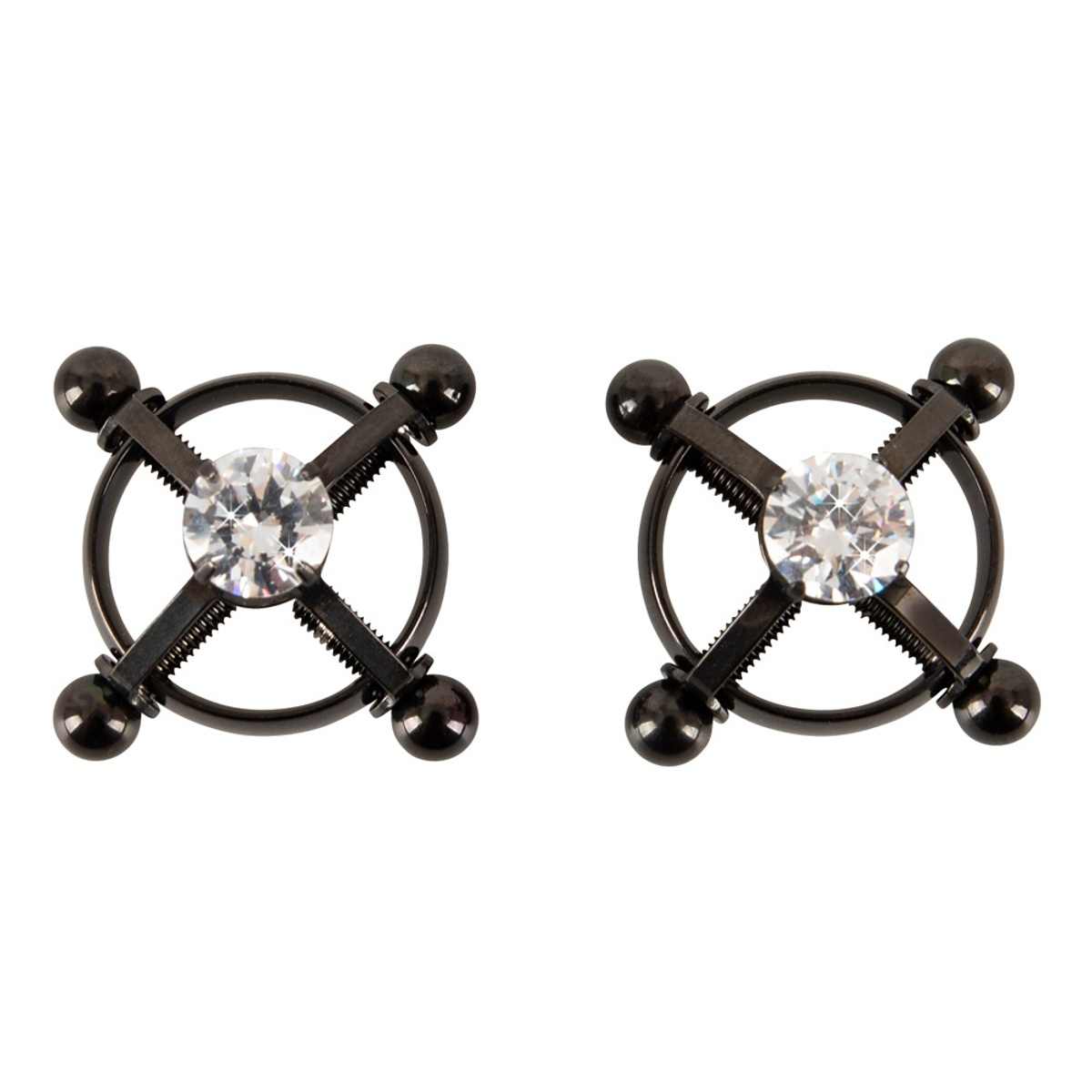 Milujete tvrdší BDSM hrátky a chcete si vychutnat maximální vzrušení? Objevte tyto fantastické skřipce na bradavky BAD KITTY v nádherném temně černém provedení. Dokonalá kombinace elegantního kroužku s dekorativním třpytivým kamínkem a extrémním sevřením vás nadchne hned na první pohled. Jsou vyrobeny z vysoce kvalitní nerezové oceli, která je neporézní a zcela nezávadná pro lidskou pokožku. Skřipce jsou navíc extrémně lehké, což zpříjemní jejich nošení. Vaše ňadra skvostně ozdobí blyštivý šperk, zatímco čtyři šrouby uchytí bradavky a dopřejí jim nezapomenutelný tlak, který si snadno sami upravíte dle požadované míry vašeho vnímání. Bradavky jsou díky nervovým zakončením nejcitlivější erotogenní zóny prsou a ve spojení se sexuálními hrátky může být toto sevření velmi žádoucí. Díky skřipcům získáte volné ruce, které jistě využijete při jiných aktivitách a bradavky vašeho otroka budou přesto sténat blahem. Tato pomůcka vám pomůže poznat skrytou touhu z lehké bolesti a podpoří erotickou fantazii. Při používání této pomůcky buďte obezřetní a vnímejte svou polovičku, aby nedošlo k poranění.
